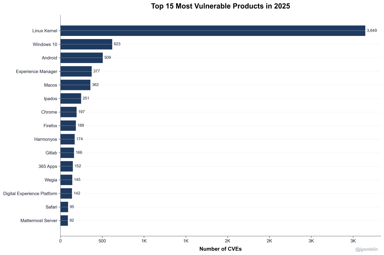 - Когда то считалось что Linux самая безопасная ОС, но сейчас – ОС самым большим количеством CVE за год (2025), в 5 раз больше чем у Windows