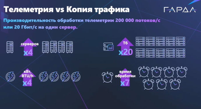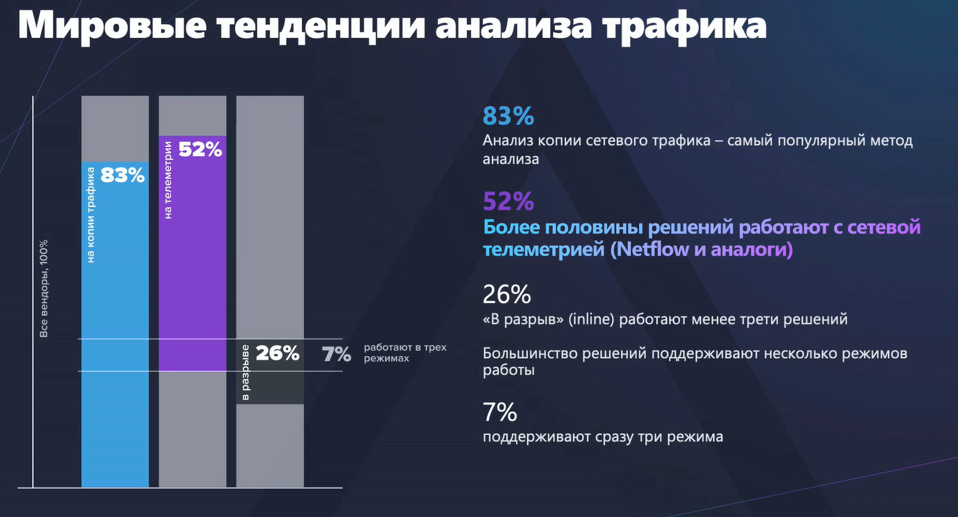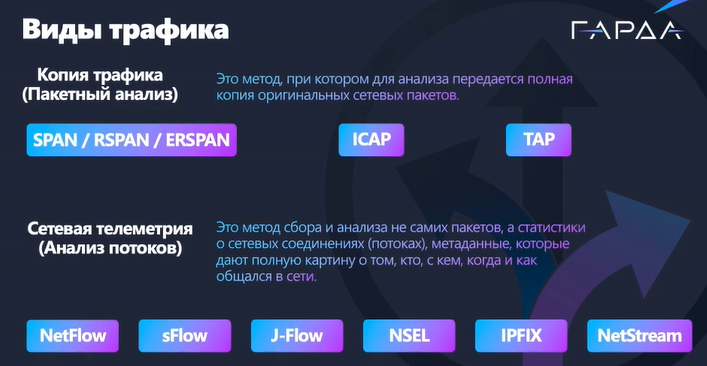 на базе съема копии всего трафика посредством использования брокера сетевых пакетов плюс TAP медные-оптические (SPAN не используют с аргументами о возможном влиянии на трафик прода/отсутствием дедупликации/разными ЗО – ИТ и ИБ) и отправки этого трафика на сенсор NTA решения (хранение обычно от нескольких дней до пары недель в зависимости от кол-ва дисков/кол-ва трафика; производительность сенсора обычно до 20 gbps, до 80TB HDD в топовом сенсоре 2RU); брокер занимается дедупликацией потоков + копированием трафика на разные системы анализа/сбора.