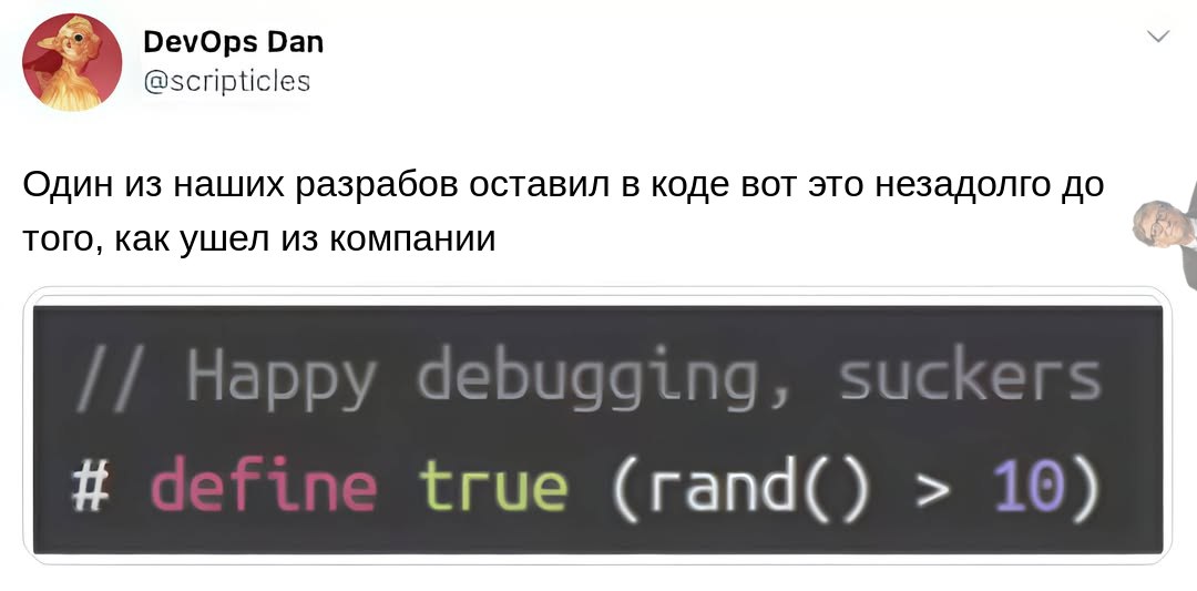 - Nested conditions (напр. вложенные if) лучше максимально избегать т.к. их сложно читать и менять. Лучше их заменять, например, логическими операциями. В целом лишние conditions/условия стараются убирать, есть даже на этот счет троллинг с созданием 4 млрд. If в исполняемом файле 40GB написанном на асемблере 🤣
