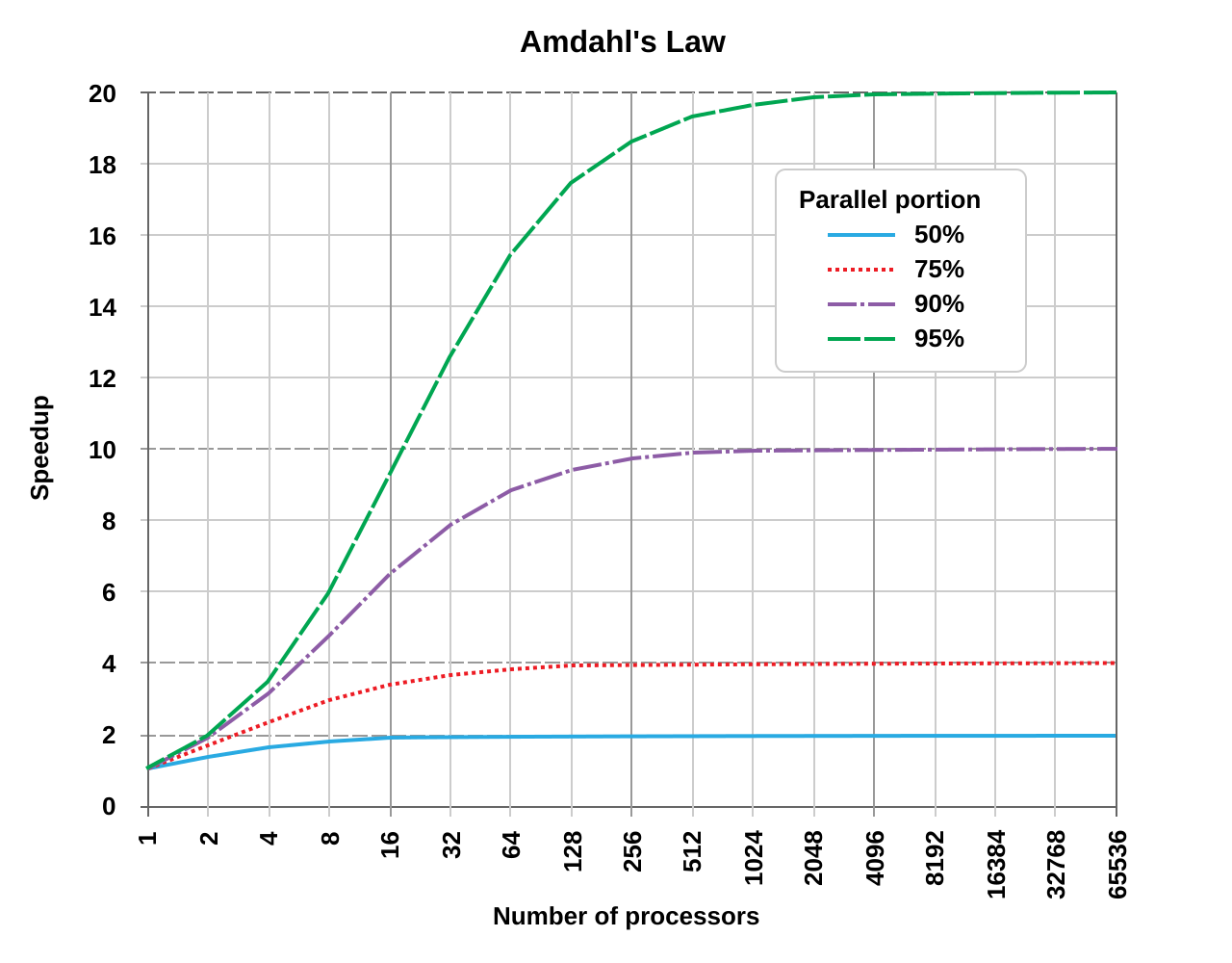 Amdahl's law demonstrates the theoretical maximum speedup of an overall system and the concept of diminishing returns. Plotted here is logarithmic parallelization vs linear speedup. If exactly 50% of the work can be parallelized, the best possible speedup is 2 times. If 95% of the work can be parallelized, the best possible speedup is 20 times. According to the law, even with an infinite number of processors, the speedup is constrained by the unparallelizable portion.